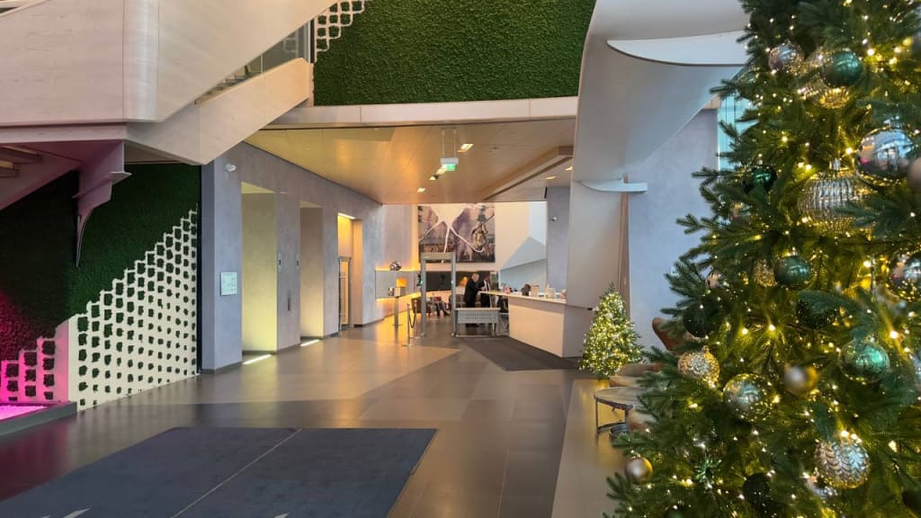 - перед собой видите красную инсталляцию, обходите ее слева и проходите через стеклянные двери;